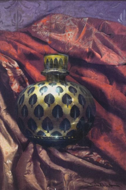 Sarah Warren (British Contemporary) Oil on canvas still life, an ornate golden vase with leaf motif on draped red material, signed lower right, within canvas slip and moulded gilt frame, 27cm x 40cm & 43cm x 56cm overall.