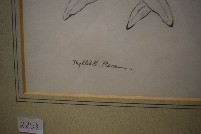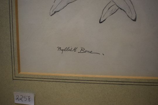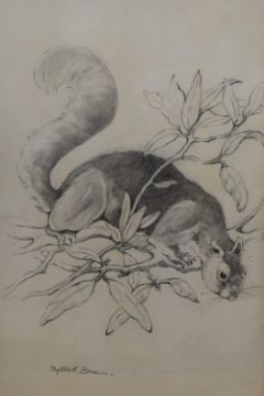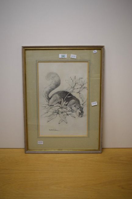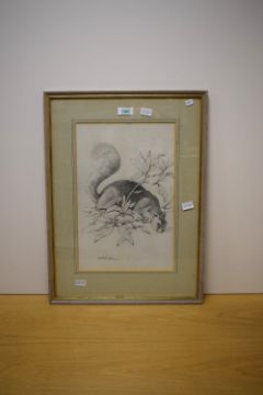 Phyllis M Bone R.S.A (British 1896-1972) Graphite on paper study 'Grey Squirrel in Rhododendron Bush', signed in pencil to lower left margin, attributed and entitled verso alongside a 'Royal Scottish Academy - Exhibition 1968' label, with washline card mount and moulded frame, under glass 23cm x 35cm & 38cm x 52cm overall.
