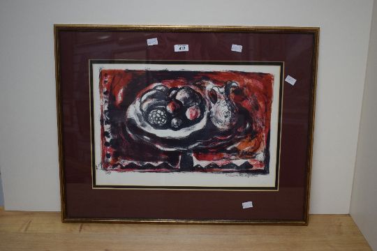 After Anne Redpath (Scottish 1895 - 1965) Lithograph, a still life study of a bowl of fruit with jug in red and black, signed in pencil to lower right margin along with blind stamp and numbered (27/75) lower left, within stepped card mount and moulded gilt frame, under glass 48cm x 33cm & 67.5cm x 52.5cm overall.
