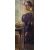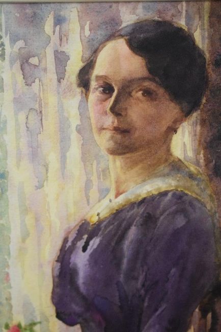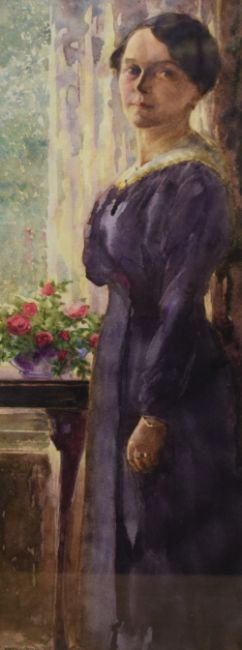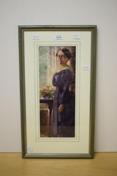 Orlando Greenwood (British 1892-1989) Watercolour, a full length portrait of a woman in purple stood beside a window, signed and dated (1918) lower left, within washline card mount and moulded frame, under glass 14.5cm x 38cm & 31cm x 55cm overall.