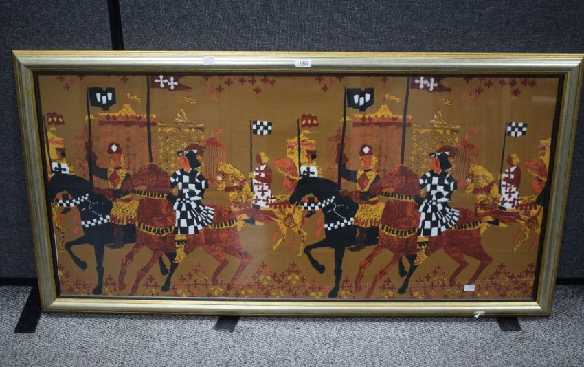 After Tibor Reich (Hungarian 1916 - 1996) Textile panel 'A Tournament', depicting figures on horseback in red/brown, within moulded gilt frame, under glass 120cm x 56cm & 131cm x 67cm overall.