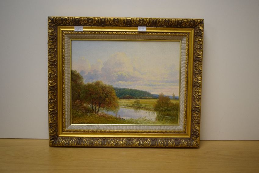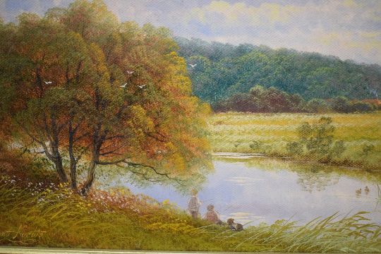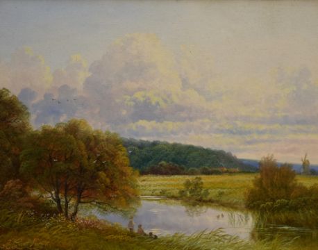Andrew Grant Kurtis (British Contemporary) Oil on canvas 'Distant Windmill', an Autumnal river scene with figures fishing, signed lower left, attribution stamp to canvas verso, 'Talbot Galleries' label and note verso containing attribution title and artists biography, within canvas slip and moulded gilt frame, 34cm x 27cm & 48cm x 41cm overall.