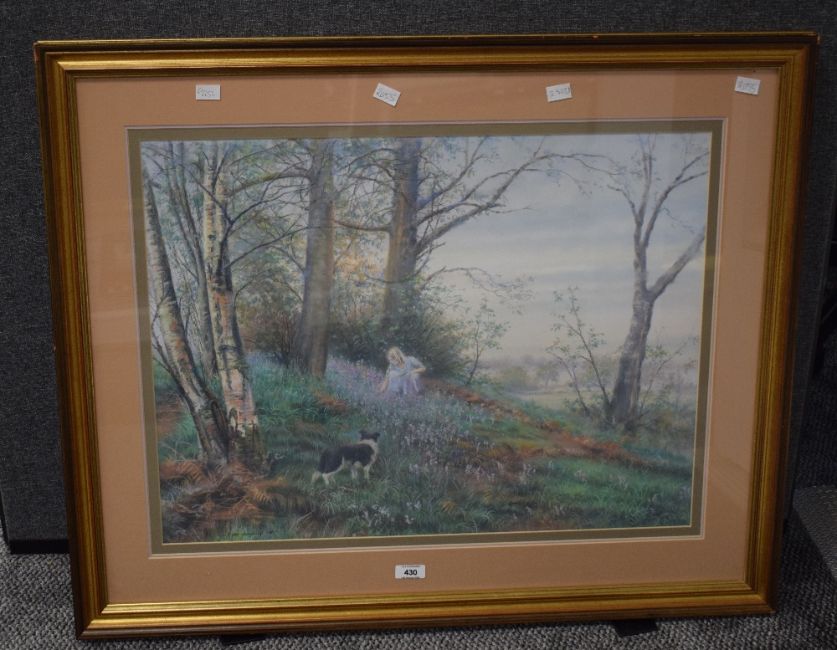 Peter Worswick (British b.1960) Pastel 'Sunday Bluebells', woodland scene with a young girl and border collie picking bluebells, signed and dated (1989) lower left, entitled and attributed verso, within stepped card mount and moulded gilt frame, under glass 62cm x 47cm & 84cm x 69.5cm overall.