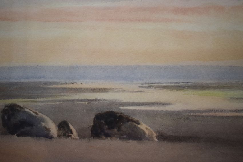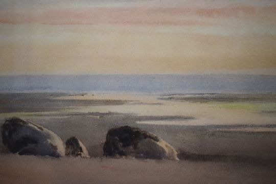 *Local Interest* Cuthbert Rigby (British 1850-1935) Watercolour, a costal sunset, signed lower right, within stepped washline card mount and moulded gilt frame, under glass 36cm x 22cm & 63cm x 47.5cm overall.