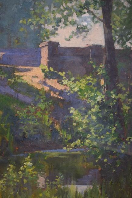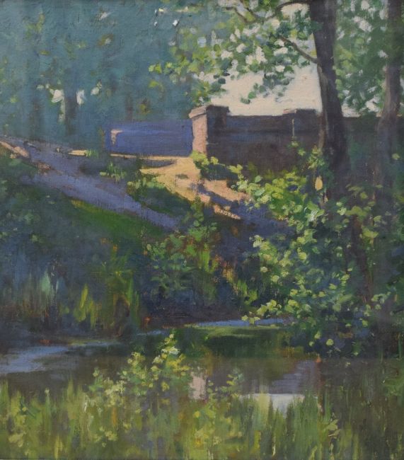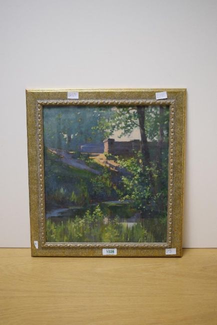 A 20th Century impressionistic oil on board, a study of sunlight on rooftops as seen through trees, unsigned or attributed, within moulded gilt frame, under glass 30.5cm x 34.5cm & 38.5cm x 42cm overall.