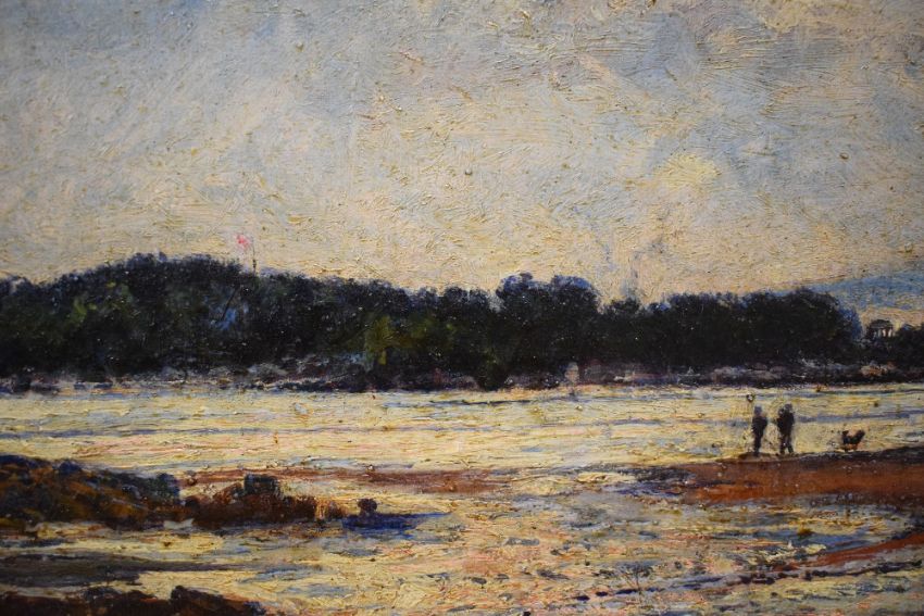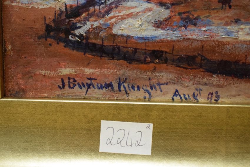 *Local Interest* John William Buxton Knight (British 1842-1908) A pair of oils on canvas, costal scenes with a view towards Arnside, both signed and dated (August 1893) lower left, within moulded gilt frames, 31cm x 24cm & 42cm x 35cm overall. Both have been reframed, one has been cleaned and repaired with a patch to canvas verso and over painting visible under UV light.
