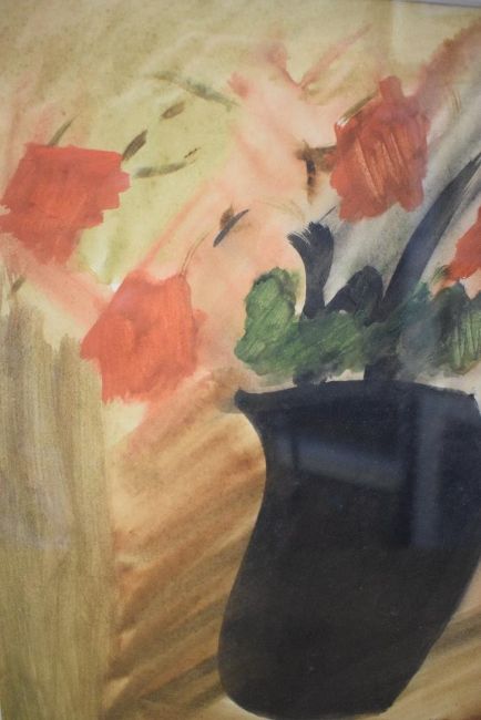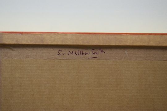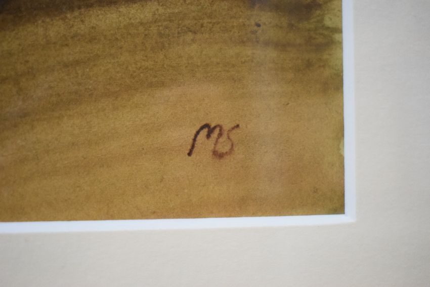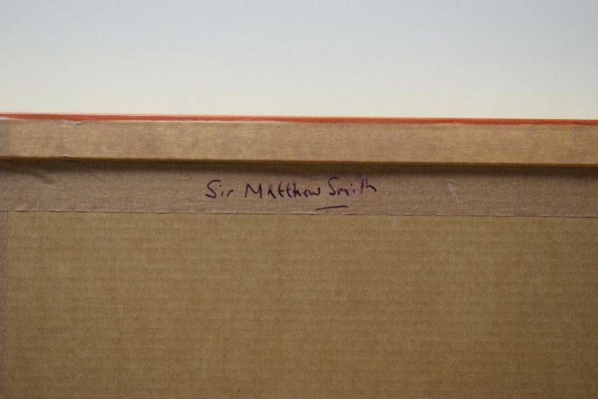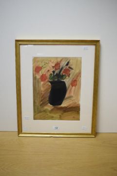 A 20th Century Watercolour still life, depicting a dark vase filled with red flowers, initialled 'MS' lower right, later attributed in pen to Sir Mathew Smith (British 1879-1959) to frame tape verso, within card mount and moulded gilt frame, under glass 26cm x 34.5cm & 44.5cm x 54cm overall.