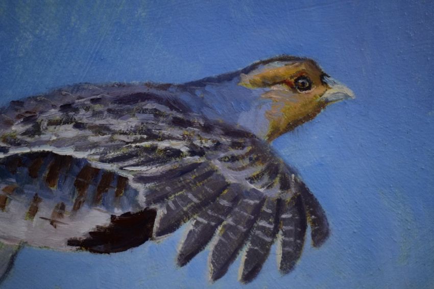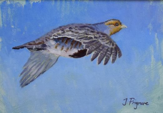 Justin Prigmore (British Contemporary) Oil on board, a study of a grey partridge in flight, signed lower right, within moulded black frame, 27.5cm x 20cm & 42cm x 33cm overall.