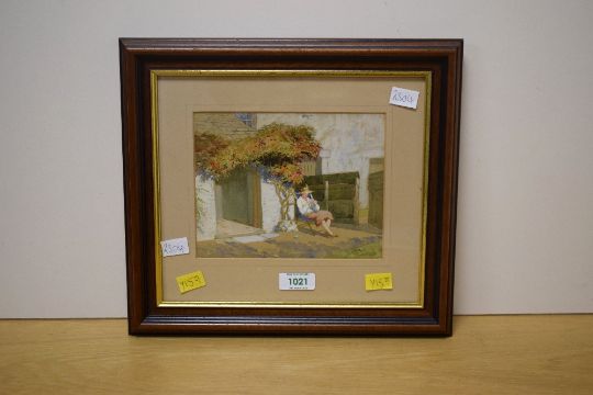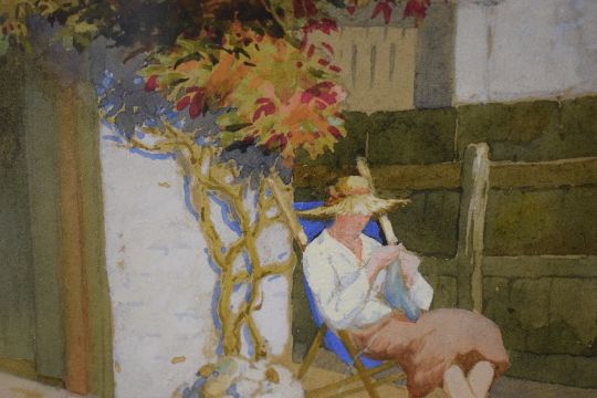 A 20th Century watercolour, depicting a woman knitting in a deck chair outside of a cottage, initialled and dated (September 1933) lower right, within washline card mount and moulded wooden frame, under glass 18cm x 14.5cm & 32.5cm x 29.5cm overall.