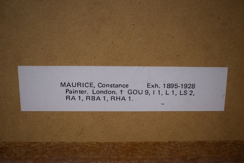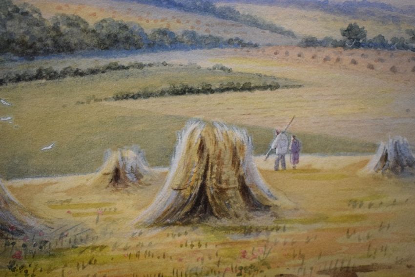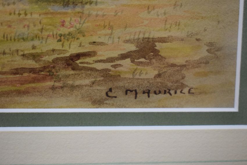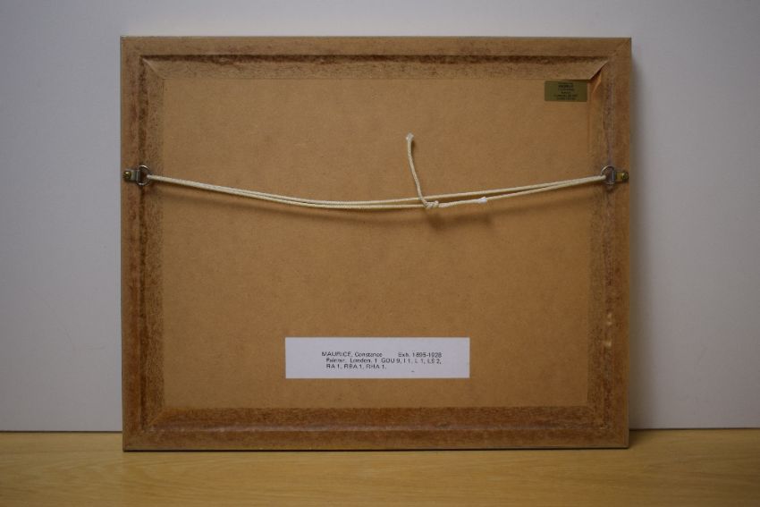 Constance Maurice (British 19th/20th Century) Watercolour, a pastoral harvest scene, signed lower right, attributed verso with exhibition label dated (1895-1928), within stepped card mount and moulded gilt frame, under glass 26.5cm x 18.5cm & 46.5cm x 38cm overall.