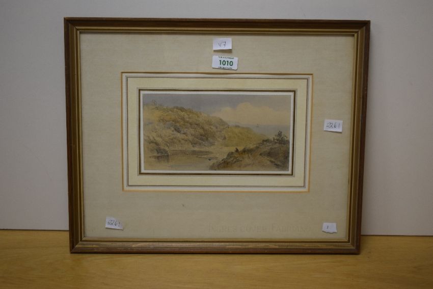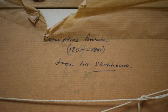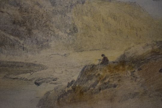 Cornelius Pearson (British 1805-1891) Watercolour, an estuary study with sitting figure, attributed verso with note informing this composition was taken 'from his Sketchbook', within stepped washline card mount and moulded frame, under glass 21cm x 11cm & 42.5cm x 33.5cm overall.
