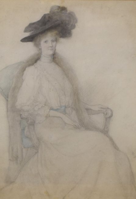 A 19th Century Watercolour portrait of a woman in period attire seated, initialled indistinctively (JM?JIM?) and dated (1895) lower right, within card mount and moulded gilt frame, under glass 23cm x 33cm & 43cm x 54cm overall.