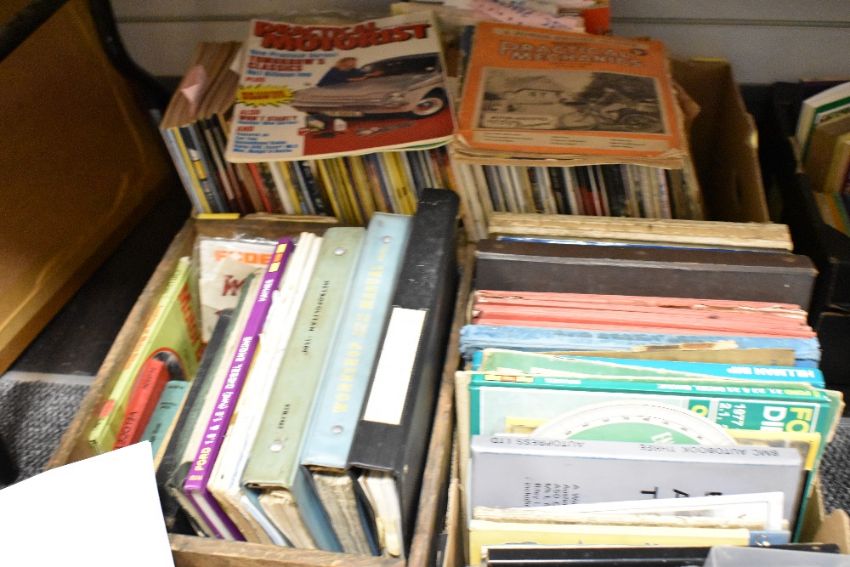A large collection of assorted motoring magazines and ephemera including workshop manuals, vintage Newns Practical Mechanics magazines and Practical Motorist magazines and an ICI Autocolour calendar printed for Carlisle Panel Factors etc.