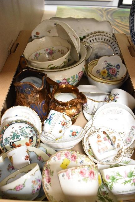 A selection of assorted ceramics including a Royal Winton Pottery planter, a selection of pretty cup and saucers, two copper lustre jugs and a selection of assorted pin dishes including Royal Worcester and Wedgwood Kutani Crane shtray etc.