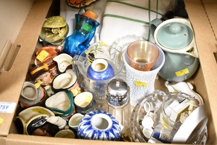 A selection of eight assorted small Toby Jugs including Royal Doulton, a green Denby water pot, a silver plated sugar sifter, two embroidered purses and a small selection of table linen etc.