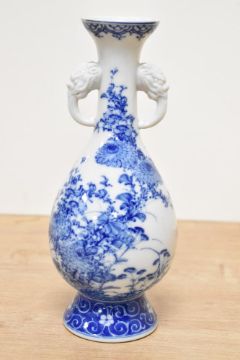 A vintage blue and white Chinese style vase having moulded lion handles 9.5cm high.