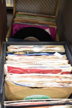 A large collection of single play records contained within two record cases including Elvis Presley-Love in Las Vegas, Blondie-The Tide is High, Jim Reeves and many others.