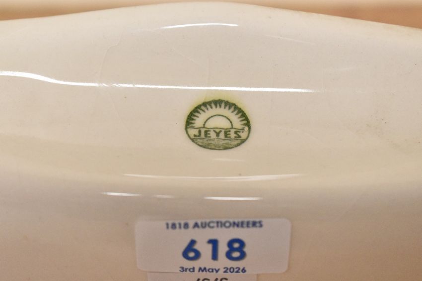 A vintage Jeyes ceramic toilet paper holder, wall mounted and designed to accomodate flat-pack Jeyes tissue refills, marked to topside, 15cm, condition is consistent with age and use, no visible chips or cracks.
