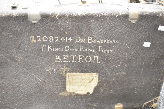 A vintage suitcase with the legend 2082414 DVB. Bowerbank, 1st Kings Own Royal Regt., B.E.T.F.O.R. Tyo front in very used condition and missing a latch.