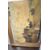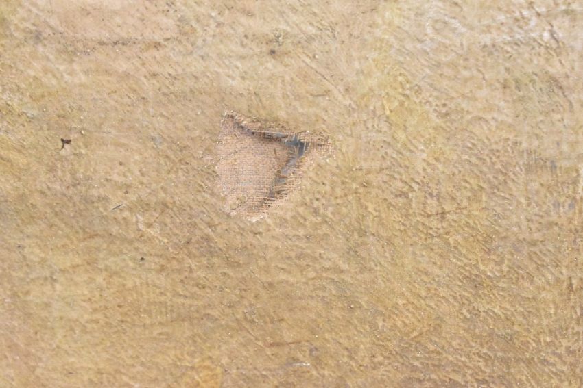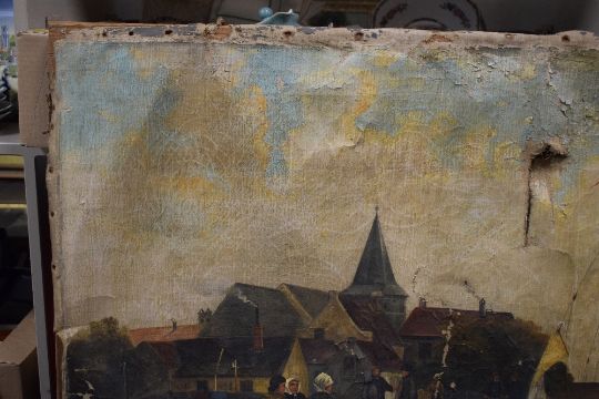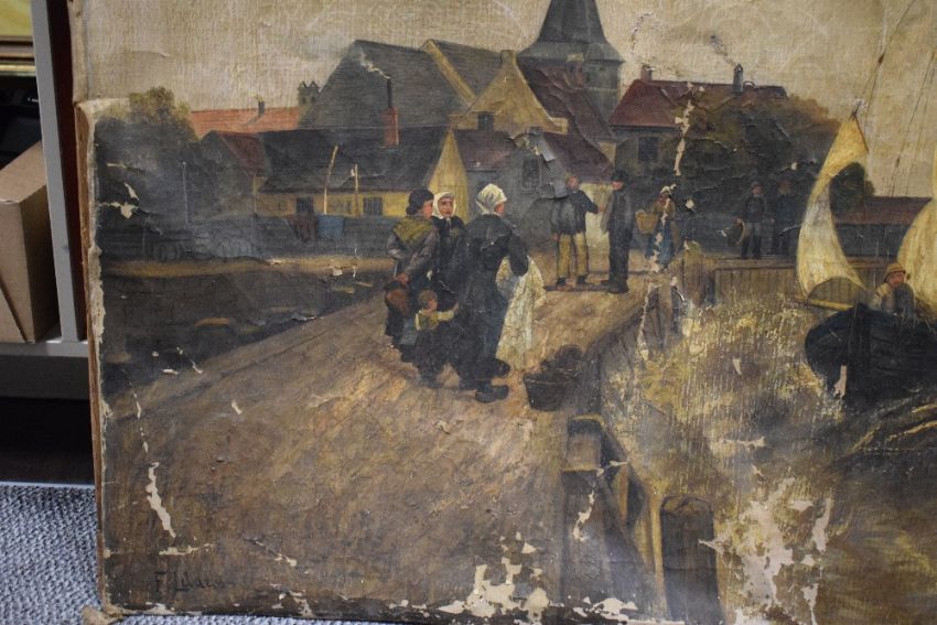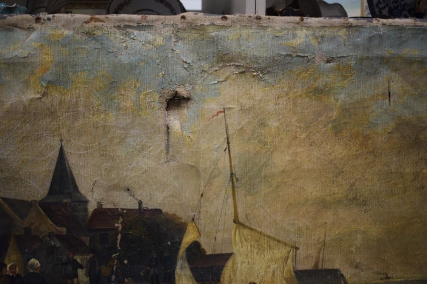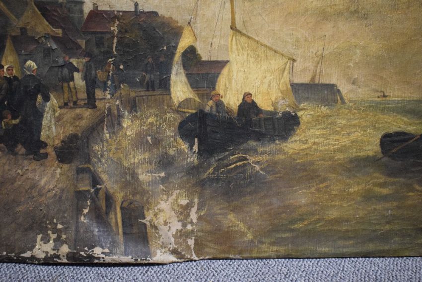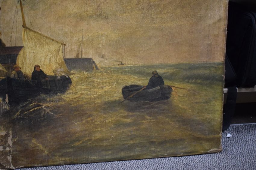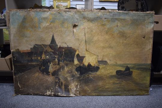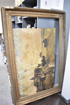 A large gilt moulded picture frame having extensive damage to moulding 164cm x 111cm x 9cm sold with an oil on canvas depicting rowing boats in harbour also having sustained extensive damage see pictures.