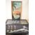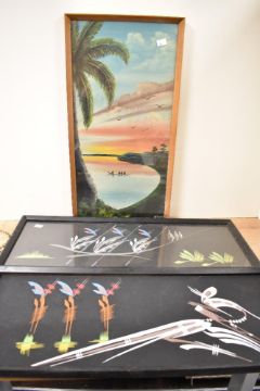 A Caribbean themed painting depicting a cove with a canoe in the distance and two vintage mid-century modern African folk art style paintings.