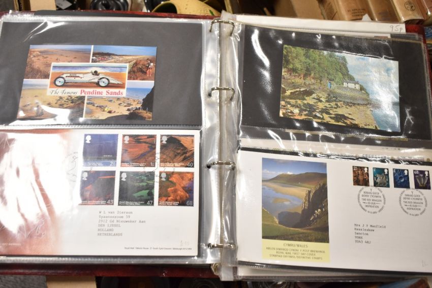 A collection of stamps contained within five stamp albums along with loose leafs, and a folder containing a selection of picture postcards.
