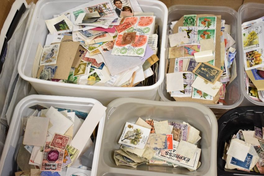 A carton of world stamps on/off paper and in tubs, good world collection.