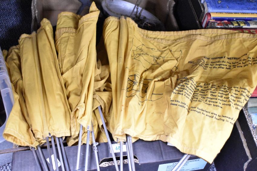 A vintage WWII RAF emergency Radio Rescue Kite (Gibson Girl Kite) designed for downed airmen to launch a wire antenna for emergency radio communication (no cover sleeve), sold with a Salter Pocket Balance scale and a selection of vintage metalware including parts of a balance scale etc.