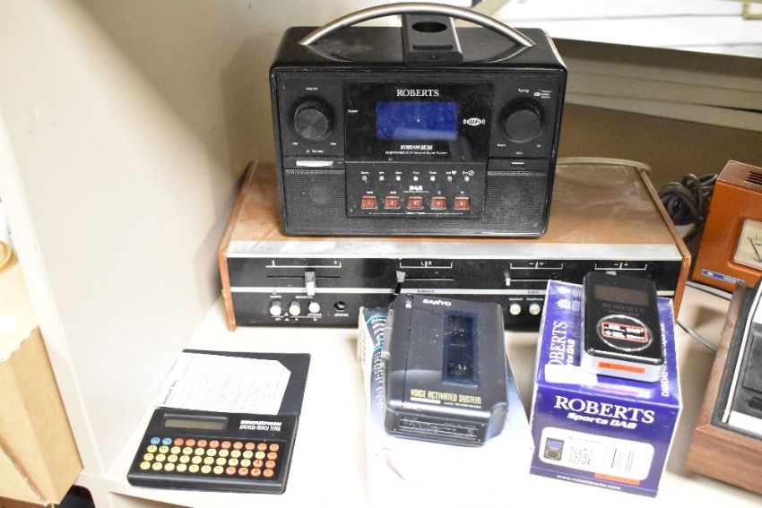 A Roberts Stream 83i DAB/FM RDS WiFi Internet Sound System, an Alpha by Highgate executive 0050 amplifyer, a #sanyo M-1119 compact cassette recorder, a Roberts Sports DAB 2 digital mini radio and an Innovations Advanced French Tutor.