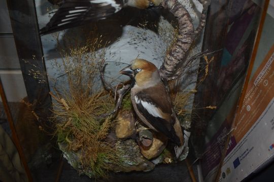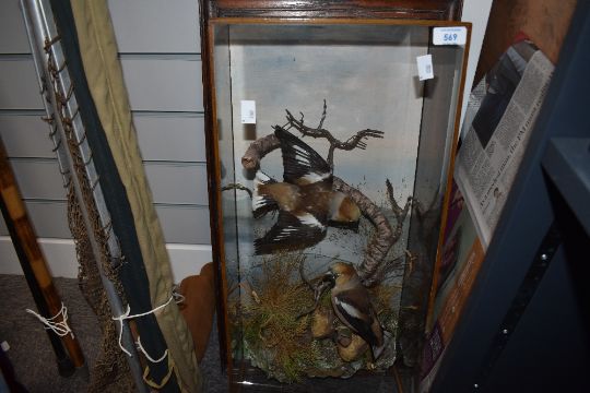A very accomplished framed and cased study of two Hawfinches with painted background and naturalistic foreground ( the front glass has been damaged but a new glass sheet for the front has been supplied)