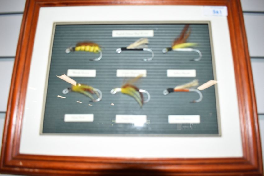A display of six mounted flies titled 'English Salmon Bait circa 1900 ' framed measuring 36cm x 29cm