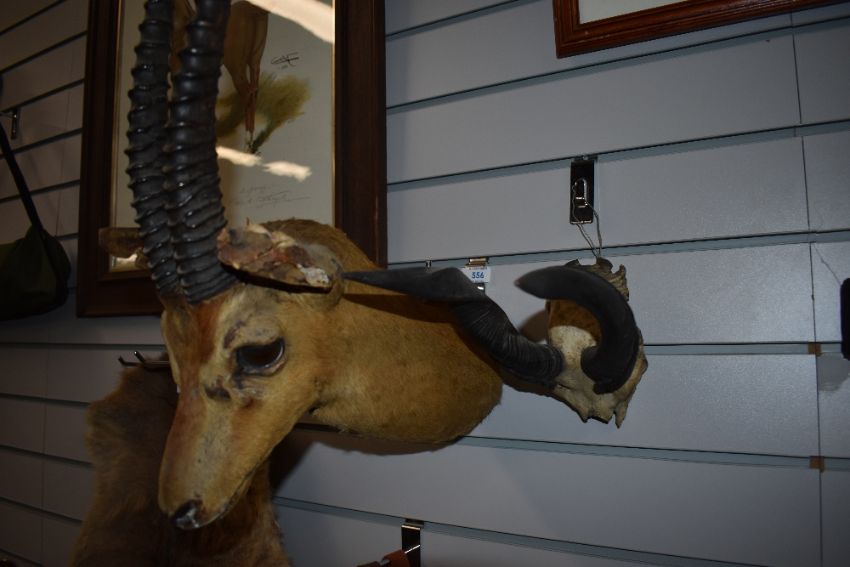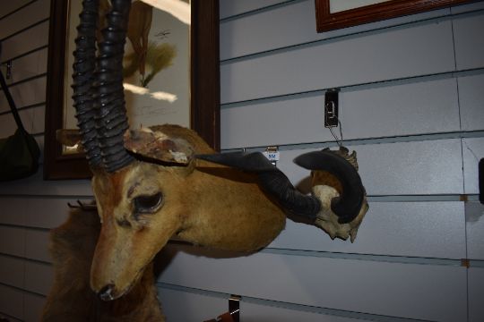 A taxidermy study of an Antelope head and neck (the ears in poor condition and a split to the rear of the head) sold with a skull and antlers from similar animal (possibly a young ibex)