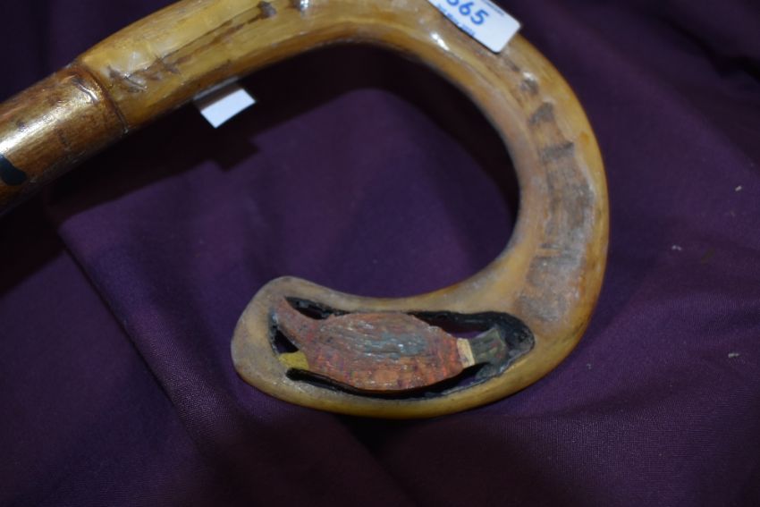Three sticks one with a sheeps horn crook with a pheasant carved into the tip of the horn