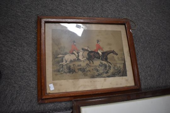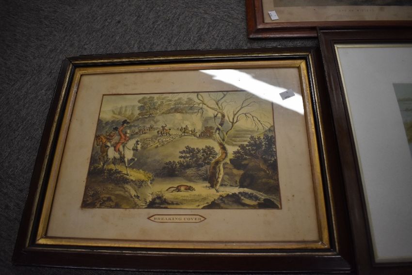A selection of 6 large hunting or shooting related prints and hand coloured etchings