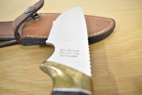 A Kershaw by Kai Japan Model 1032 Big Skinner fixed blade hunting knife, 3' blade, 9' overall in original sheath with belt attachment This item can only be purchased by someone over the age of 18