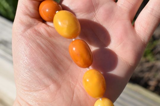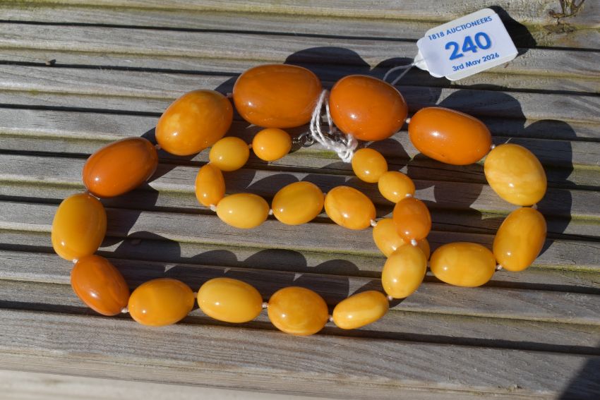A string of butterscotch amber beads of oval uneven form, measuring between 3.5cm and 1.5cm, having a silver clasp marked 925, approximately 52cm, 57.9g