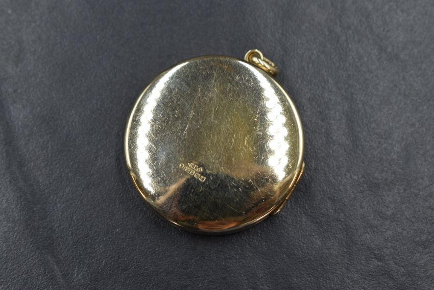 A 9ct gold locket pendant, of circular form having scroll decoration to the front, marked 375, 3cm diameter, 11.2g