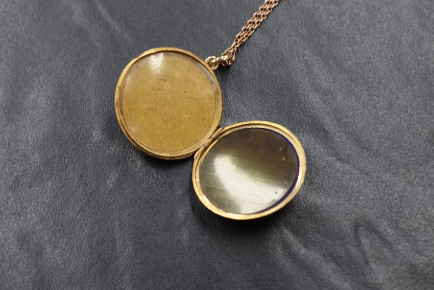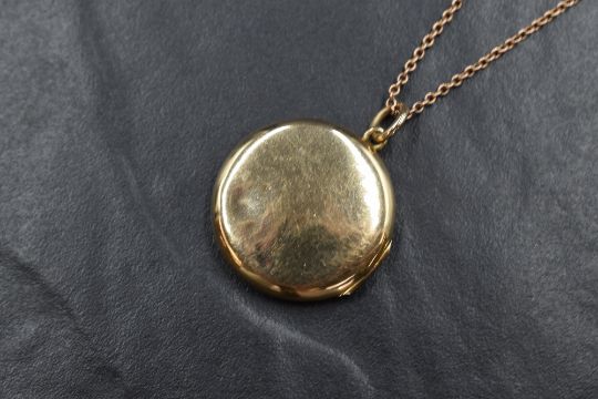 A 9ct gold circular locket of plain form on an 18' 9ct rose gold chain having barrel clasp, approx 5.4g