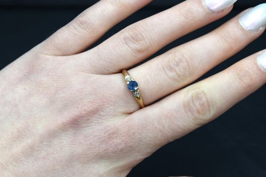 A 9ct gold sapphire and diamond chip ring having a central sapphire in a claw set mount flanked by two diamond chips in star mounts on a 9ct gold loop, size P & 2g, scuff damage to sapphire