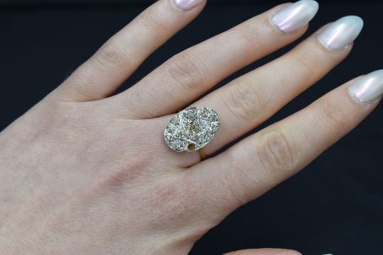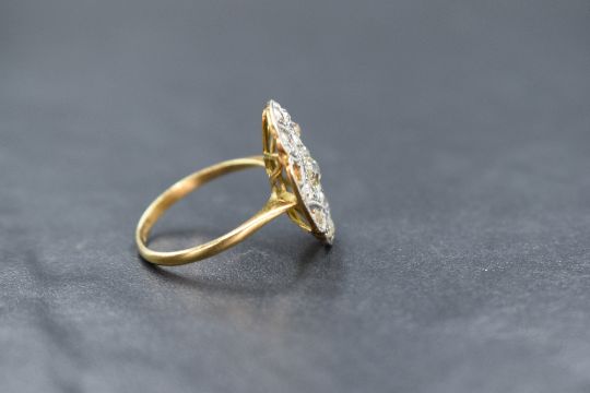 A yellow metal diamond plaque ring having 14 old cut diamonds, total approx 1ct (1 stone missing) in a decorative pave setting, on a yellow metal loop stamped 18ct & plat