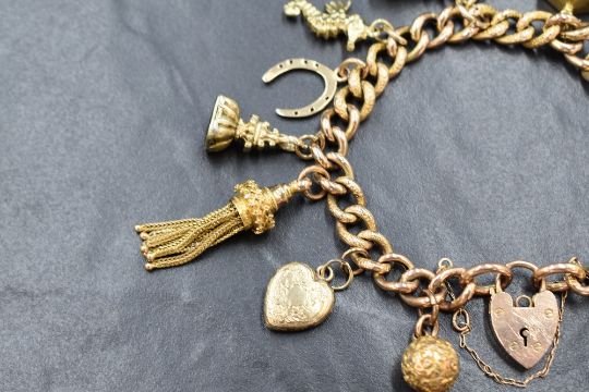 A 9ct gold curb link charm bracelet, having a heart padlock and twelve gold and yellow metal charms including two wax seal fobs, a citrine spinner fob, a heart mourning locket and a Victorian tassel, marked 9ct, 38g gross