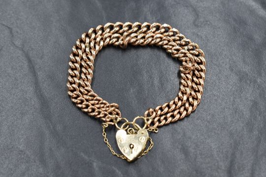 A 9ct rose gold double curb link bracelet with later 9ct gold padlock clasp and safety chain, approx 180mm long & 39.7g