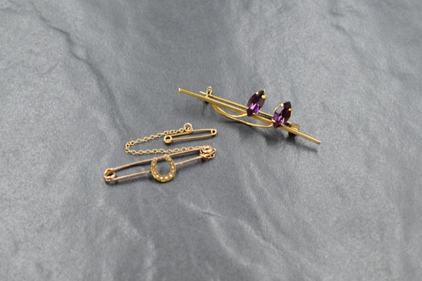 A 9ct gold bar brooch having two decorative paste stones set as flower buds, and a yellow metal bar brooch with seed pearl horseshoe decoration, approx 3.7g total