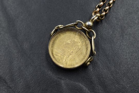A yellow metal watch chain marked 9C having rolled gold T bar and silver mounted Victorian diamond jubilee fob, damage to fob loop, approx 16g gross & 280mm long