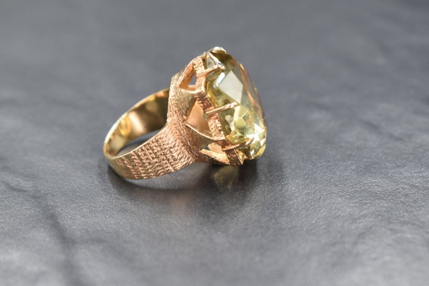 A 9ct gold citrine set statement ring, the star motif lemon tone citrine measuring approximately 22mm x 10mm, in a claw setting, having textured decoration to the shoulders, marked 375, ring size N, 11.9g