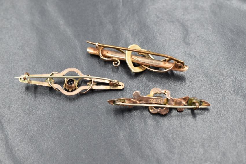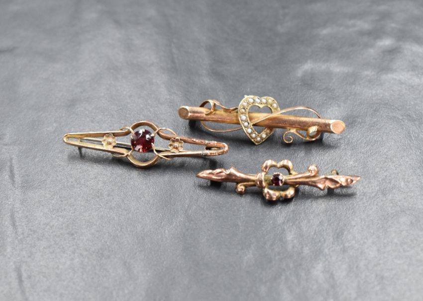 A group of three 9ct gold bar brooches, comprising one having a seed pearl set heart and two having garnet set floral motifs, marked 9ct, 5.2g gross
