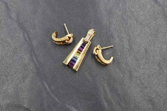 A Guy Laroche diamond and multi-gemstone pendant, the diamond chip set loop having channel set graduated rainbow gemstones, along with a matched pair of hoop earrings, having 'Guy Laroche' to the sides of both, marked 18K, 7.7g gross