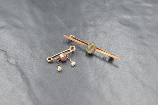A 9ct gold moss agate set bar brooch, having an oval bezel set moss agate on a bar brooch, along with a 9ct gold amethyst and seed pearl set brooch, having a bezel set amethyst with two seed pearl drops, marked 9ct, 2.3g gross
