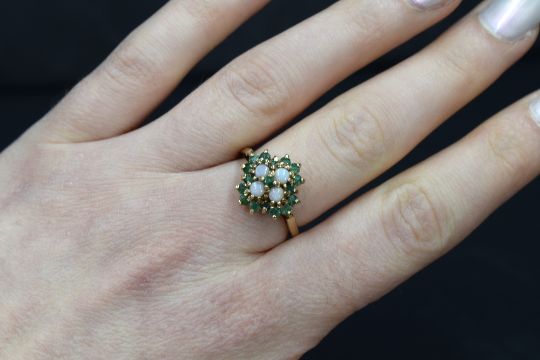 A 9ct gold emerald and opal square cluster having four opal cabochons within a surround of sixteen small emeralds, all in a claw set basket mount on a 9ct gold loop, size M & 3.4g