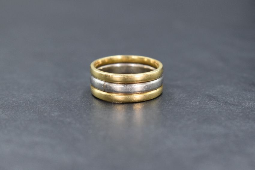 A two-tone yellow and white metal band, thought to be 18ct, the central white band flanked by two yellow bands, unmarked, ring size M-N, 9.5g